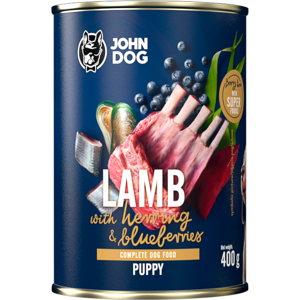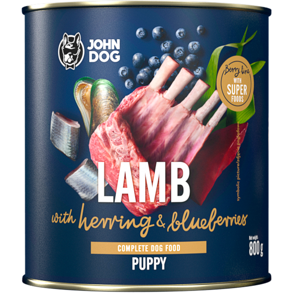 John Dog conserva pentru caini Miel, hering si afine - Junior 800gr