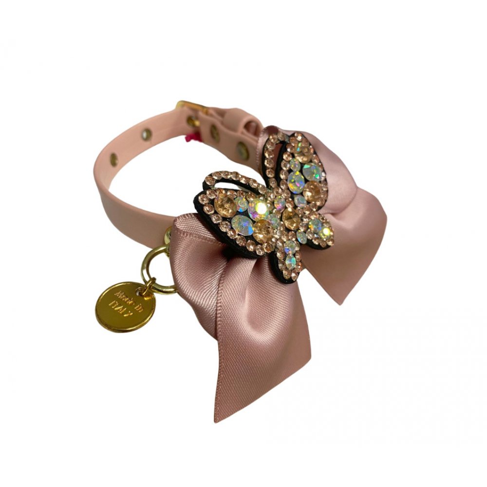 Zgarda Butterfly wings - Roz Zgarda din piele ecologica  Decorata cu funda si fluturas din cristale  Lungime: 25 cm