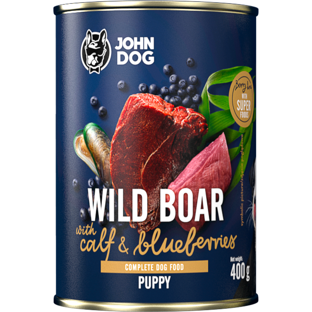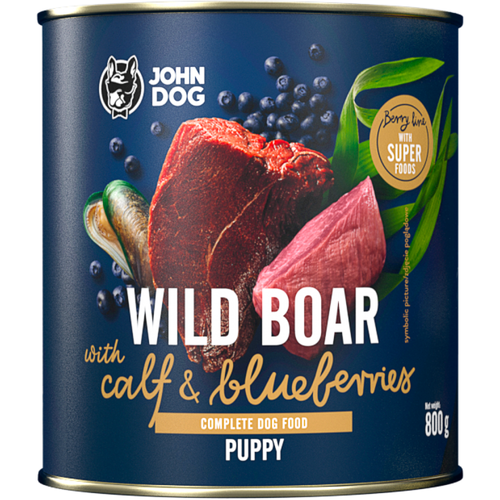 John Dog conserva pentru caini Mistret, vitel si afine - Puppy 800gr