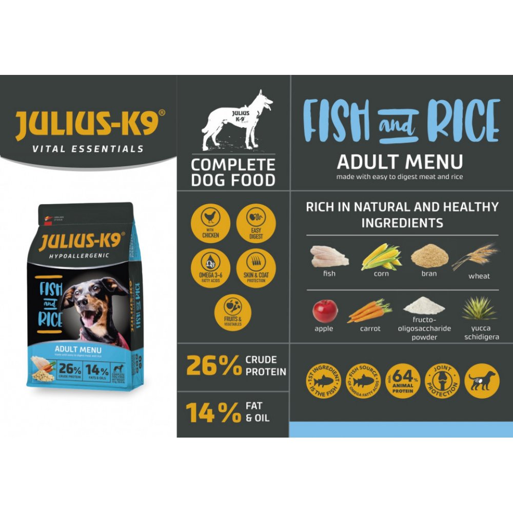Julius K9 Adult - Hrana Uscata Premium, Hipoalergenica - Peste Si Orez - 3kg