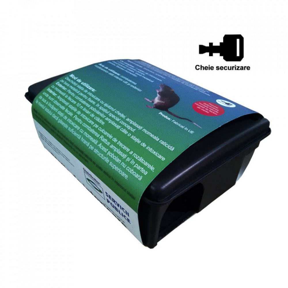 Indicații: Stație de intoxicare destinata amplasarii de momeli raticide care previne accesul speciilor nețintă, animalelor de companie sau a copiilor la momelile raticide. Specii tinta: Șobolani, șoareci. Ce conține: 1 stație de intoxicare, 1 cheie de plastic pentru deschiderea stației, bară metalică pentru fixarea momelilor. Aria de utilizare: combaterea rozătoarelor atât interior cât și exterior. Mod de utilizare: Deschideți stația de intoxicare cu ajutorul cheiței, amplasați momeala raticidă pe bara metalică pentru fixare, în spațiul special conceput. Exterior: Pentru combaterea șobolanilor amplasați câte o stație de intoxicare cu momeală la fiecare 10 m liniari de clădire. Interior: Amplasați stațiile de intoxicare pe culoarele de trecere a rozătoarele, unde sunt observate fecale. Pentru combaterea Rattus amplasați și în partea de sus a încăperii stații de intoxicare cu momeală. Acest șobolan nu coboară la nivelul solului dacă găsește suficientă hrană pe structurile superioare. Notă: Pentru utilizarea stației de intoxicare fără momeală raticidă se poate aplica în interiorul stației o capcană adezivă în spațiul dedicat împreună cu un atractant. Dimensiuni: Cutie: 230 x 180 x 95 mm Dimensiuni orificiu acces rozătoare: 55 x 50 mm