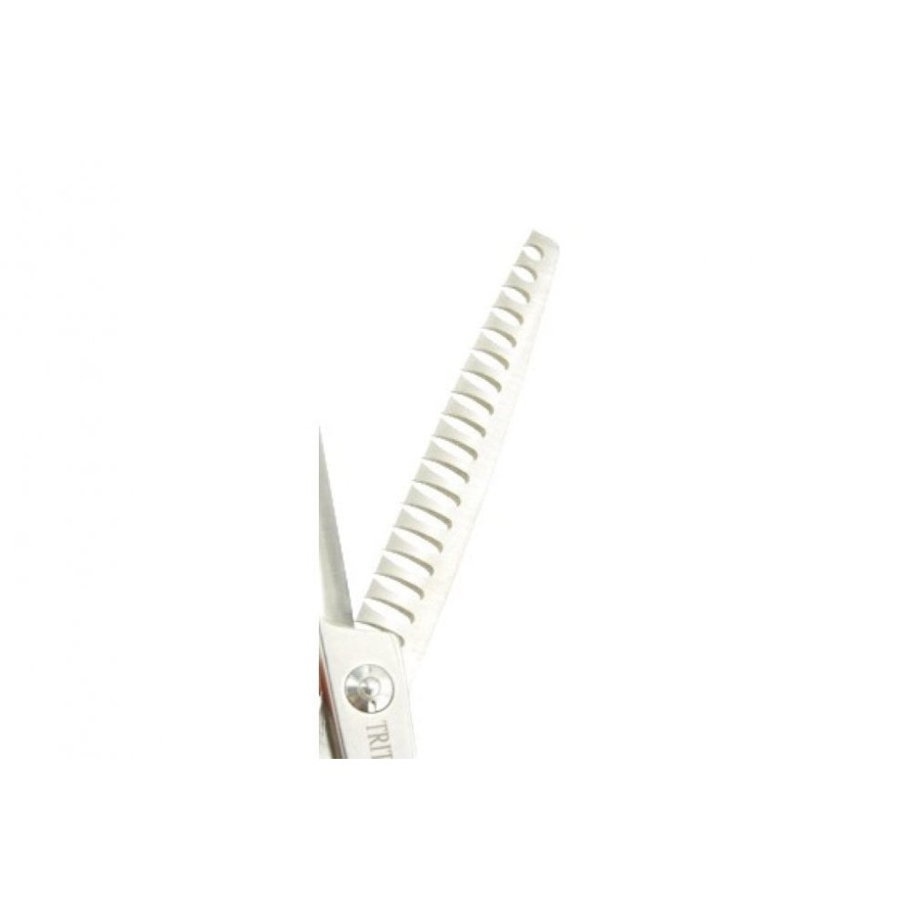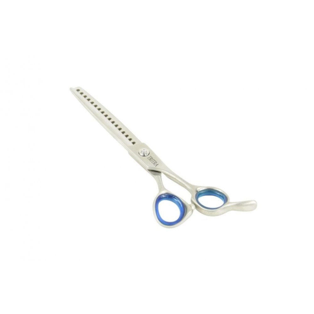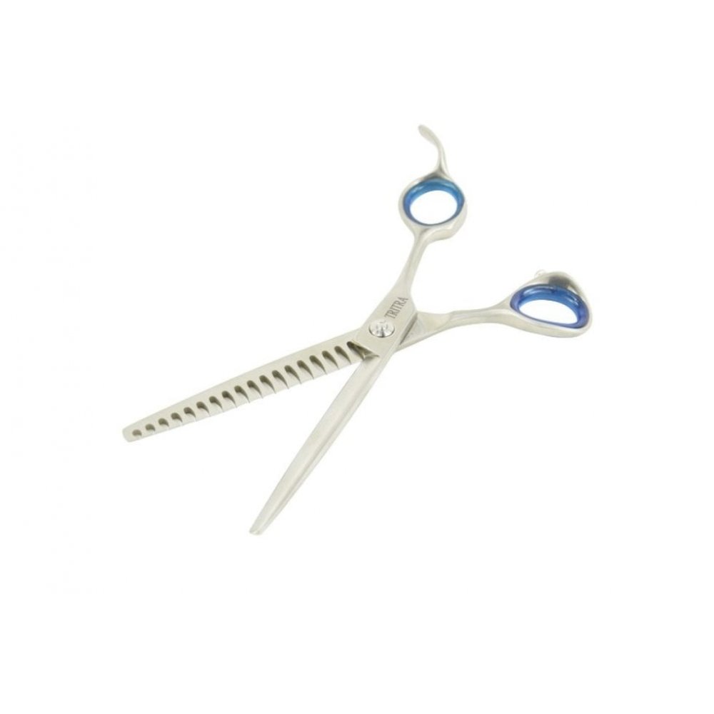 Chunker  Tritra 22199. Așa-numit "chunker", pentru dreptaci, cu 18 dinți, 7 inch (17 cm), calitate 440c. Perfectă pentru toate tipurile de blană groasă, cum ar fi cea de bouvier sau doodle.Nota: foarfecele sunt reglate si echilibrate de catre producator. Pentru orice interventie asupra lor, va rugam sa va adresati unui specialist.Pentru a proteja si pastra lamele foarfecelor se recomanda curatarea lor dupa fiecare utilizare ( utilizand un  material textil deosebit de fin ) si lubrefierea cu Show Tech ulei pentru foarfeci