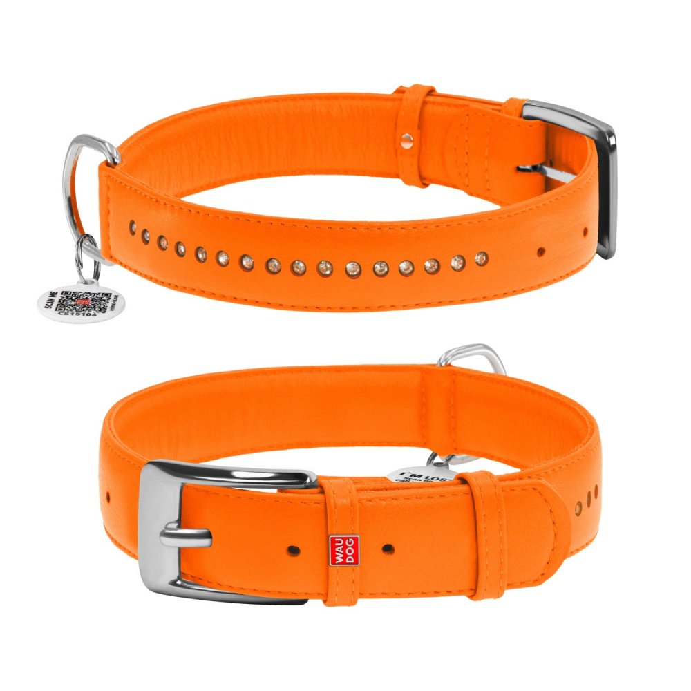 Zgarda piele pentru caini WAUDOG Glamour cu pietricele - Portocaliu M - 30-39cm